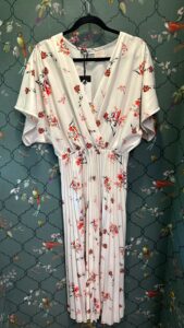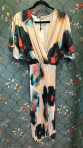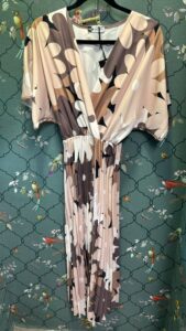 שמלה באורך מידי-מקסי בגזרה נשית ורכה, עם חלק עליון בגזרת מעטפת שיושבת בצורה מחמיאה על הגוף. שרוולים רחבים באורך מרפק מעניקים מראה קליל ואלגנטי. החצאית עשויה מבד נשפך עם פליסה קלאסית שיוצרת תנועה חיננית בכל צעד.