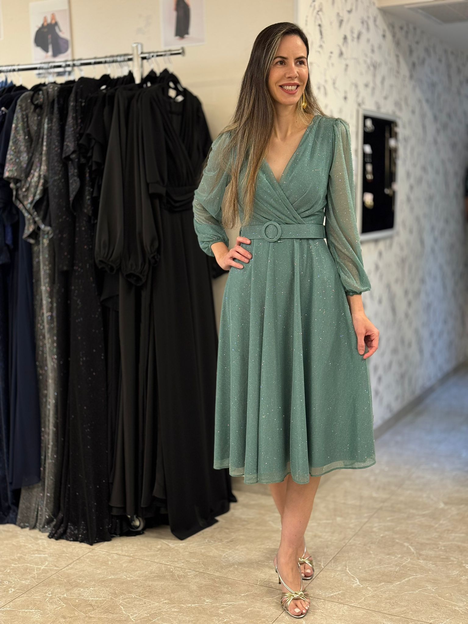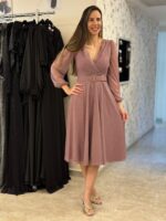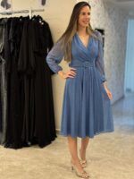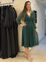 שמלת מעטפת אלגנטית ומחמיאה עם חגורה תואמת במותן, המבליטה את הגזרה בצורה מעודנת. עשויה מבד שיפון קליל עם נצנוץ עדין המעניק מראה יוקרתי אך רך.