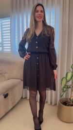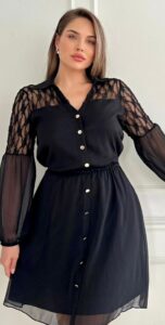 שמלה שחורה אלגנטית בשילוב תחרה עדינה, בגזרה זורמת ומחמיאה.